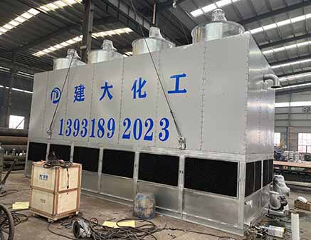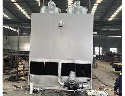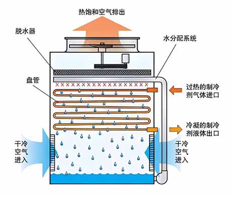 设备从上至下由轴流风机、收水装置、喷淋管及喷头、换热管束、新风进口、蓄水箱及循环水泵等主要部分组成。